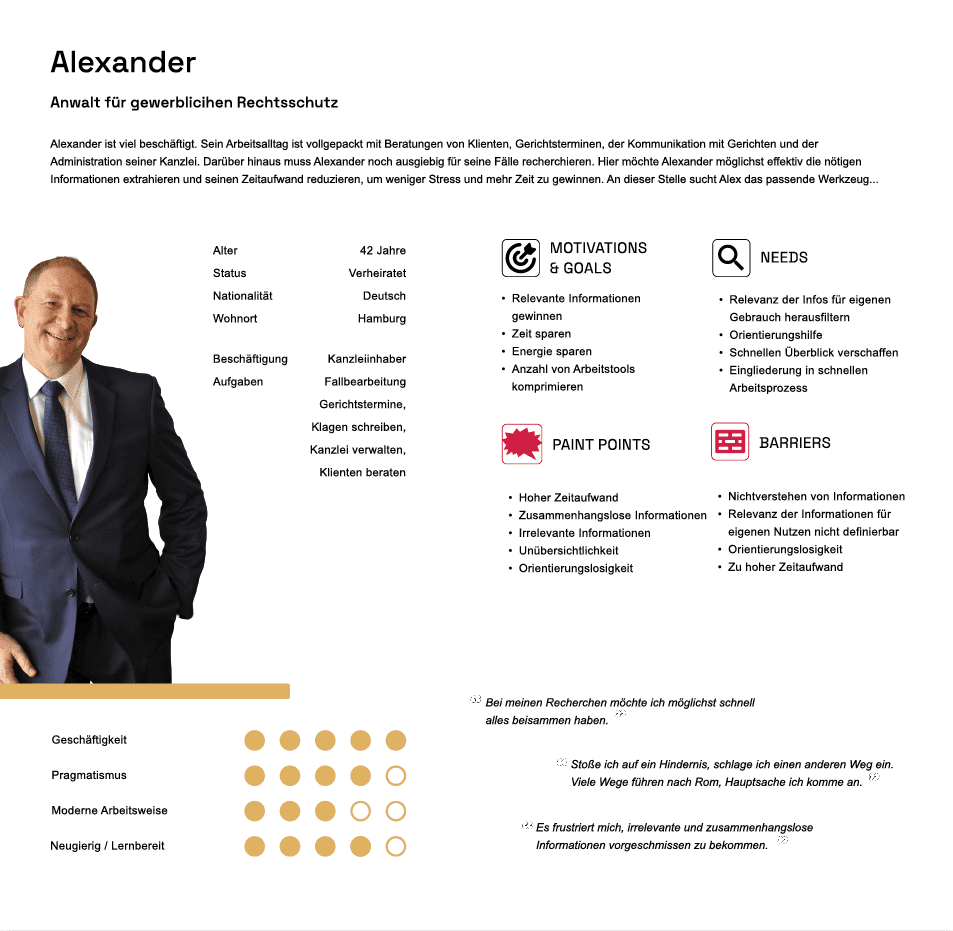 Alexander represents a pragmatic and highly busy legal professional. As the owner of a law firm specializing in commercial legal protection, his days are tightly scheduled. Research must be efficient, structured, and reliable. He does not seek exploration. He seeks clarity.